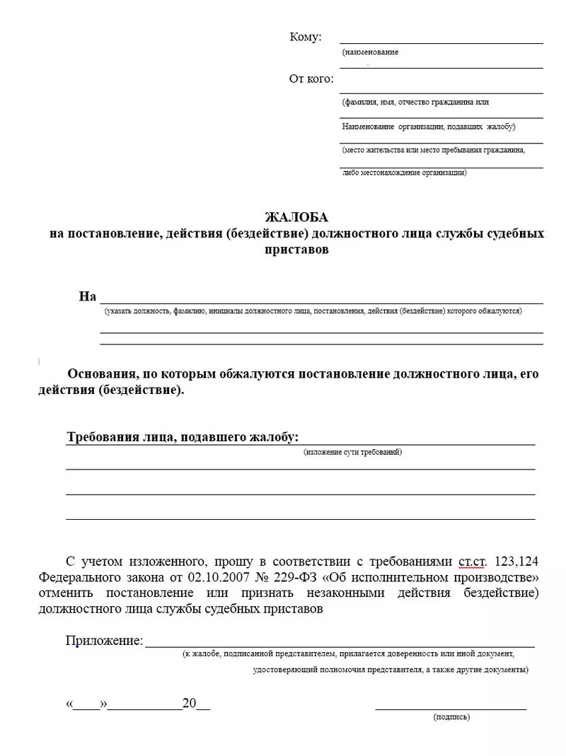 Жалобу можно направить через официальный сайт ФССП (в разделе "Обращения"/ "Интернет-приемная"), лично или заказным письмом. Составьте ее по такому образцу: