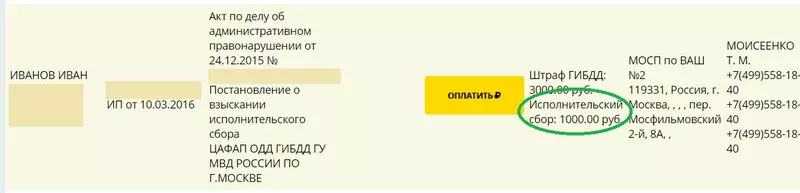 Если против вас назначен исполнительный сбор, это будет видно в таблице задолженностей на сайте ФССП. Сумма исполнительского сбора указана в 6-ой колонке рядом с размером долга.