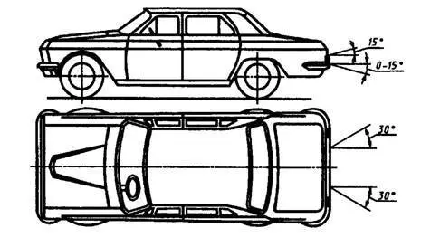 1Государственный регистрационный знак должен быть видимым в пространстве, ограниченном четырьмя плоскостями, образующими углы видимости не менее: вверх - 15°, вниз - 0°, влево и вправо - 30° (рисунок 1).