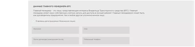 В блоке «Данные главного менеджера ВТС» поставить галочку напротив пункта «Я являюсь регистрируемым физическим лицом».