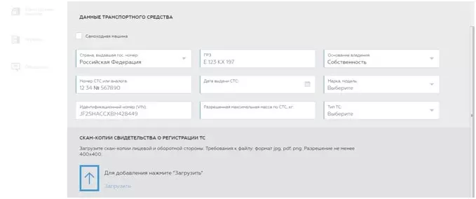 Заполнить данные ТС и загрузить копию свидетельства о регистрации транспортного средства.